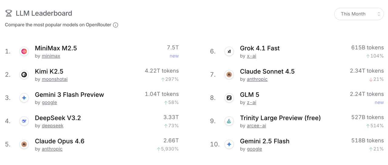 在 OpenRouter 平台中,MiniMax 模型持续位居受欢迎度榜首,驱动 MaxClaw 提供最前沿的 AI 能力。